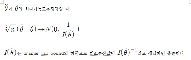 적절한 조건(regular condition)하에 최대가능도추정량은 표본의 크기 n이 충분히 크면 최소 분산을 가지고 정규분포에 수렴한다.(asymptotically efficiency & normality)