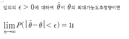 최대가능도추정량은 표본의 크기 n이 충분히 크면 parameter에 확률수렴한다.(consistency)