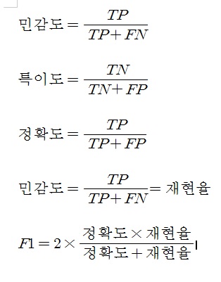 민감도, 특이도, 정밀도,재현율, F1score를 구분함