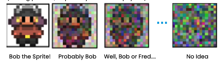 비슷하게 'Bob the Sprite!'에서 시작하여 noise를 추가할수록 나중에는 어떤 형체인지 알아볼 수 없게 된다.