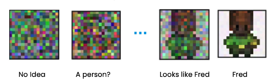 No Idea의 순수한 noise 이미지에서 시작해서 노이즈를 점점 제거하여 Fred의 완전한 이미지로 바뀐다.