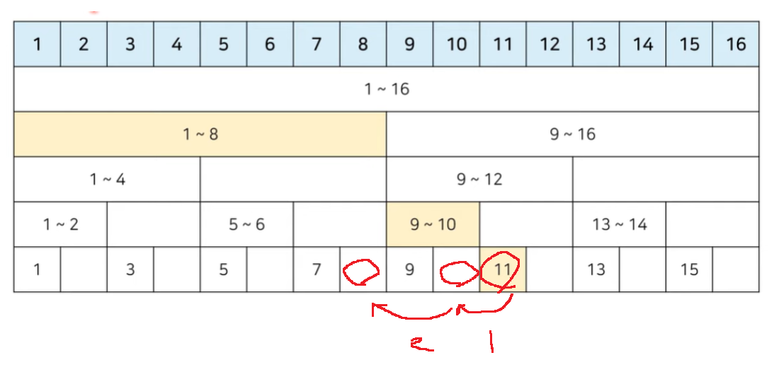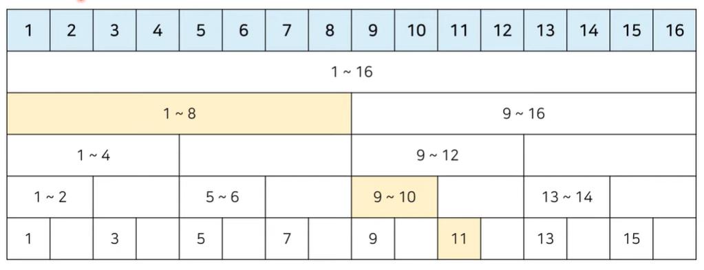 그러면 tree 구조 상 1~8번까지 누적합 + 9~10 누적합 + 11번, 3개 원소 합을 구하면 된다.