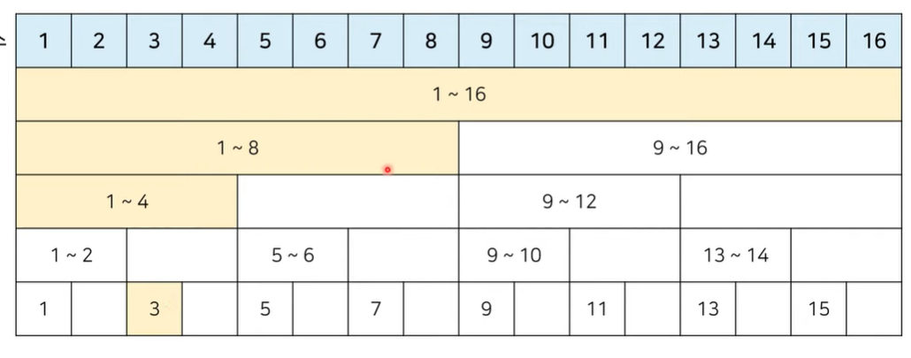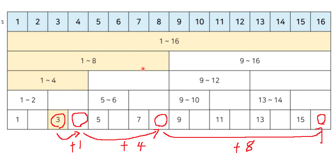 그러면 3번째 원소를 포함하고 있는 1~4번째 원소 합(4번째 index), 1~8번째 원소 합(8번 index), 1~16번째 원소 합(16번)