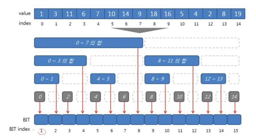 binary indexed tree의 각 인덱스 i의 0이 아닌 마지막 비트가 k이면, 해당 index는 0~k-1번째 원소까지의 합을 저장한다.