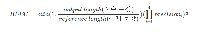 4-gram precision까지 계산한다면 최종 BLEU score를 아래 그림과 같이 계산함