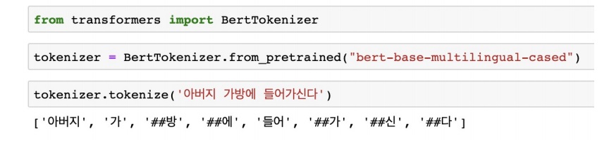 위의 코드에서 ‘bert-base-multilingual-cased’라는 pretrain model에서 사용한 berttokenizer를 불러온다는 것