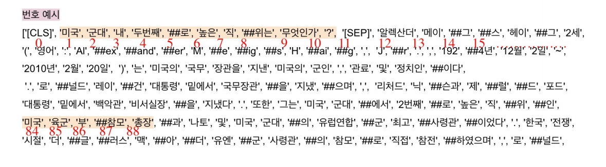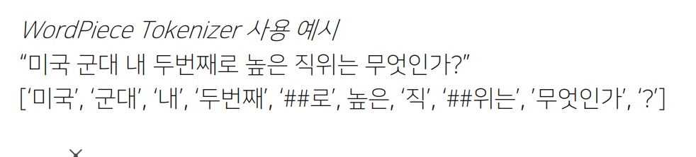 wordpiece tokenizer는 자주 나오는 단어는 ‘미국’, ‘군대’, ‘두번째’처럼 하나의 단어로 만들고 자주 나오지 않는 단어는 ‘내’, ‘로’, ‘위는’,’직’으로 나뉨
