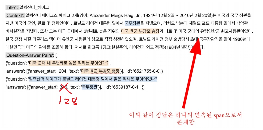 이런 가정을 할 수 있다면 정답 text를 생성하는 문제가 아니라 지문 내 정답 text의 위치를 찾는 문제로 바뀌어 편리해진다