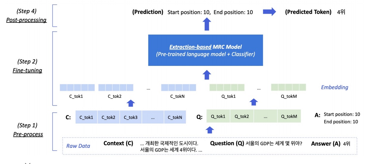 각각의 token을 embedding하여 vector로 만들고 pretrained extraction MRC model에 전부 넣어서 fine-tuning을 수행