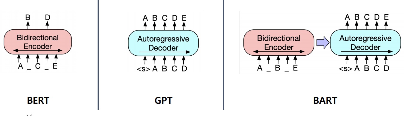 위 그림처럼 BART는 BERT처럼 bidirectional한 encoder와 GPT처럼 unidirectional한 decoder를 활용한 encoder, decoder 구조로 이루어짐