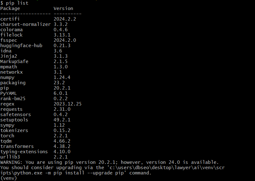 (venv)로 가상환경을 activate하고 'transformers' 패키지가 설치된 상태에서..