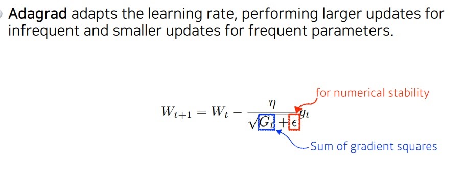 Adagrad는 gradient의 제곱 누적합을 이용하여 learning rate에 벌점을 부여함.