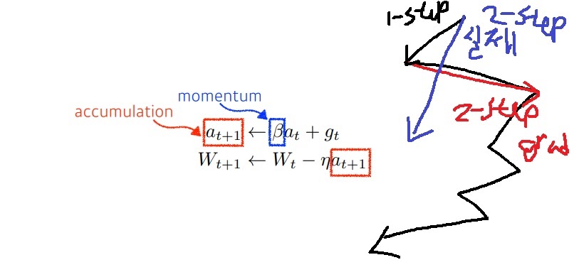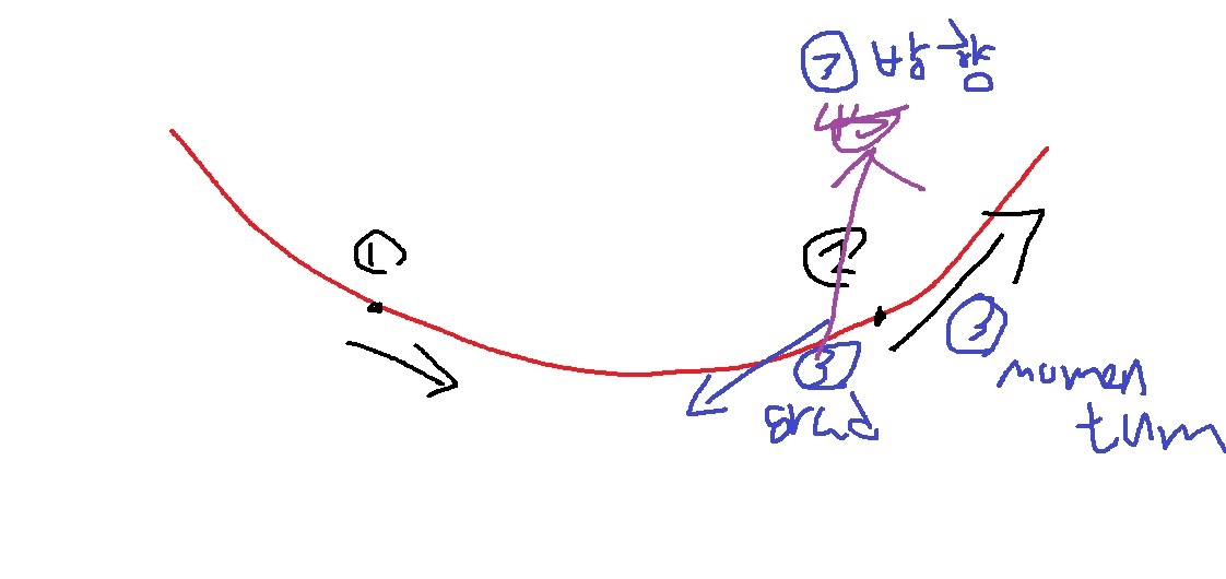 3step에 내려가야하지만 이미 gradient가 올라가는 쪽이어서 3step momentum 방향이 올라가는 느낌이라