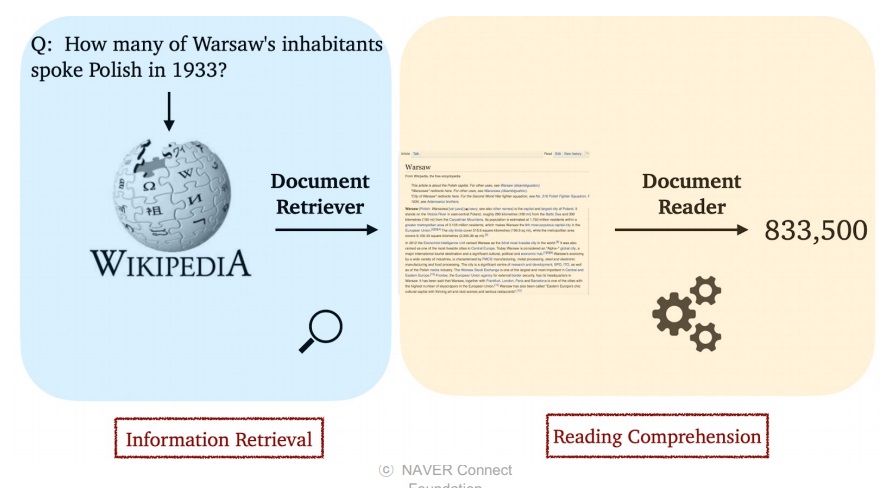 구체적인 방법은 위키피디아 같은 대형 웹에서 retriever를 이용해서 질문을 주어 관련성이 높은 문서를 검색함