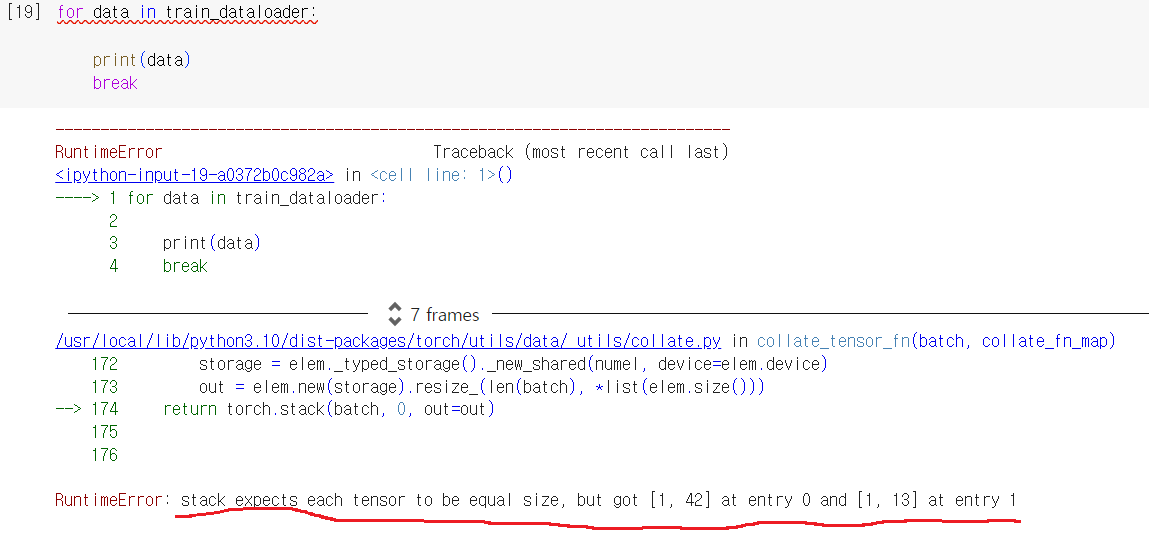 그리고 dataloader에서 데이터를 순회하면... 이렇게 데이터끼리 size가 안맞는다고 에러가 남