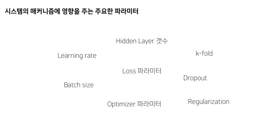 batch_size, learning rate, loss, k-fold, dropout, regularization, optimizer, hidden layer 종류는 많음