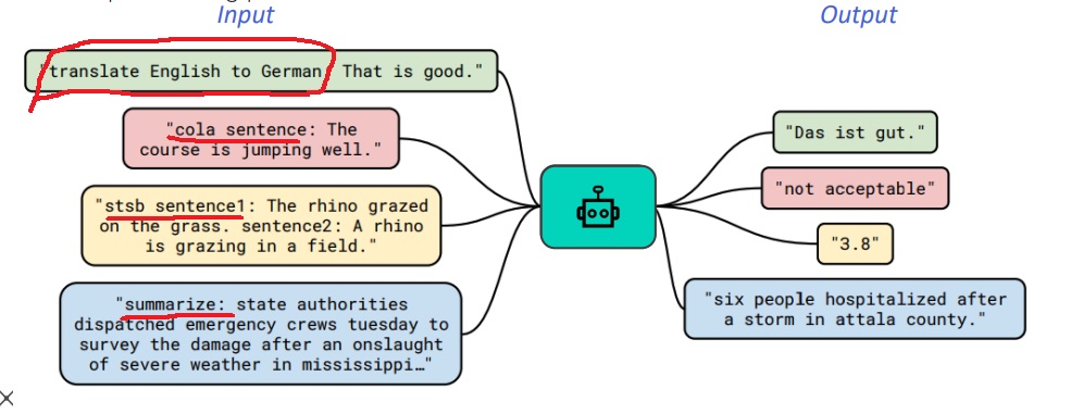 위 그림에서 초록색 부분을 보면 “translate English to German: That is good.”을 input으로 주었는데