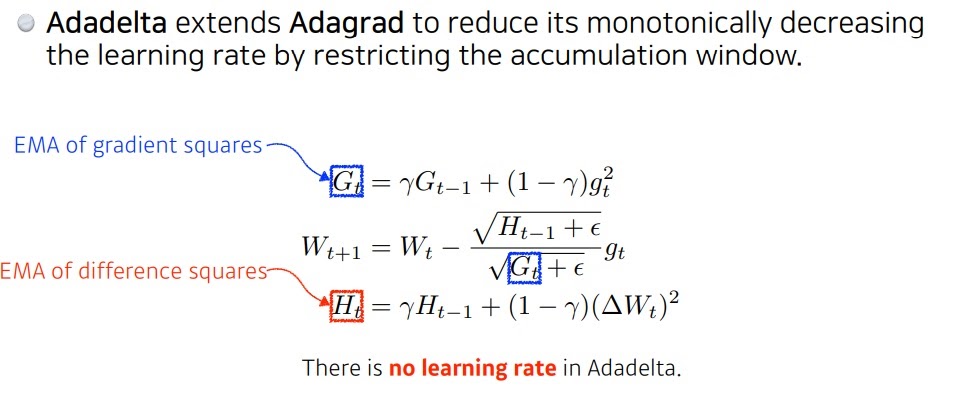 Adadelta는 $G_{t}$의 계속되는 증가를 막고자 exponential moving everage 방법을 이용하였다.