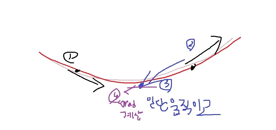 3step에 내려가야하지만 이미 gradient가 올라가는 쪽이어서 3step momentum 방향이 올라가는 느낌이라