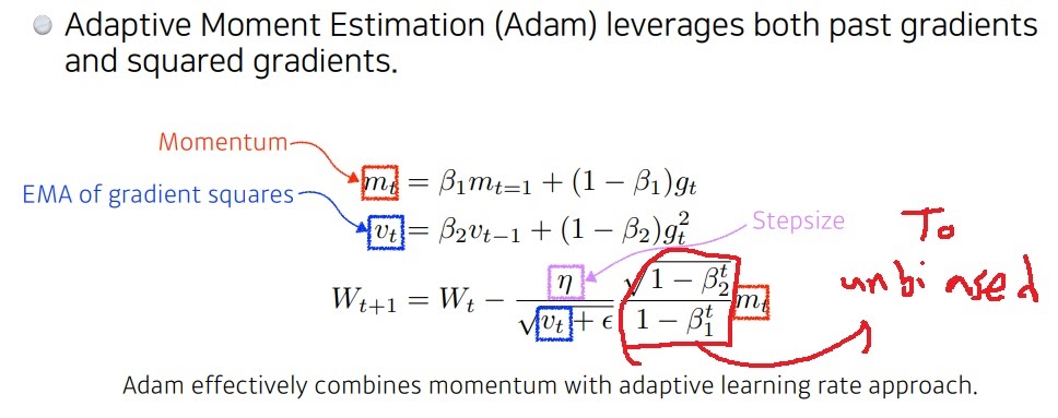 learning rate를 adaptive하게 조절하는 gradient의 exponential moving average 방법을 모두 혼합하였다.