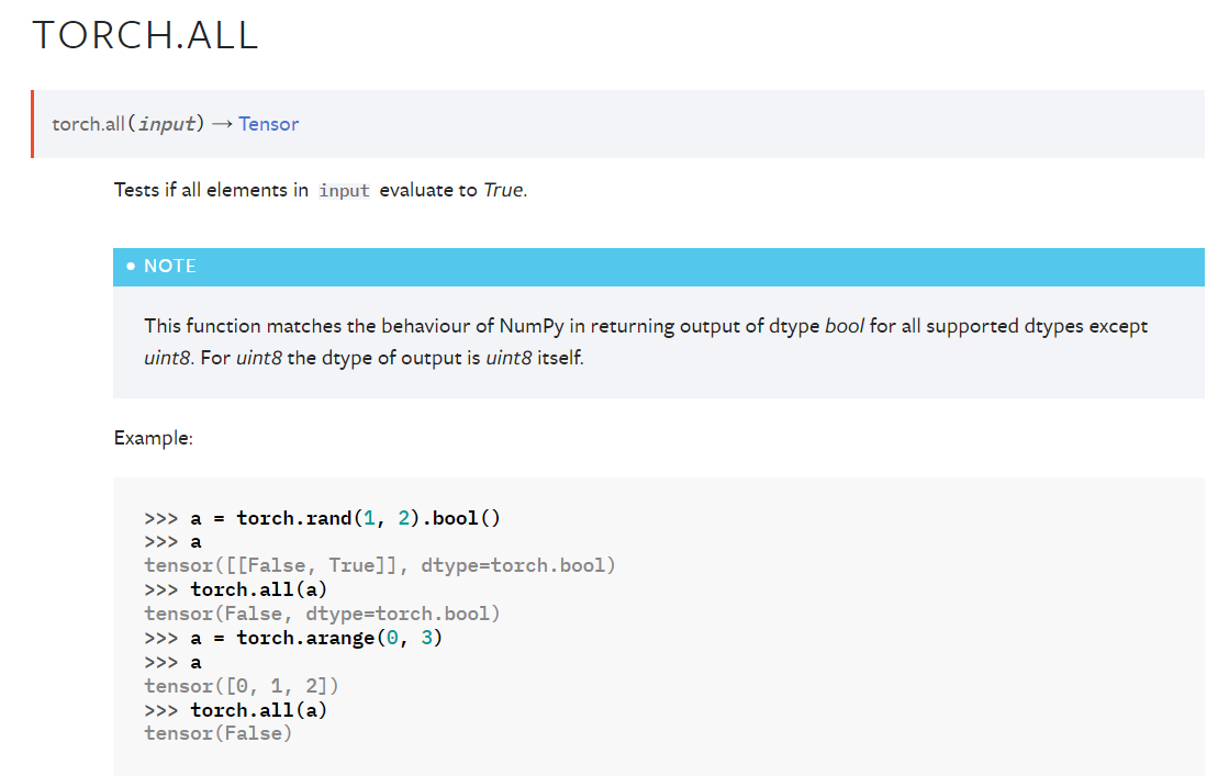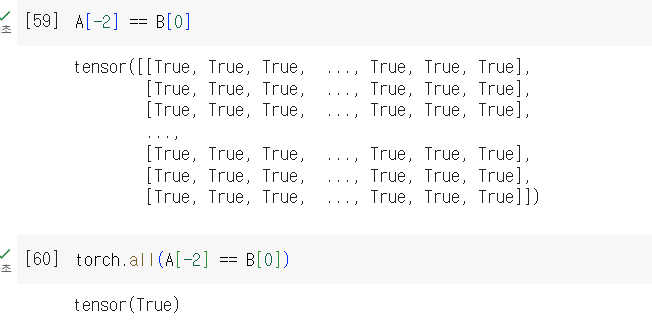 torch.all()을 이용해서 boolean tensor의 모든 boolean을 비교해서... 전부 True이면 True이고 하나라도 False이면 False