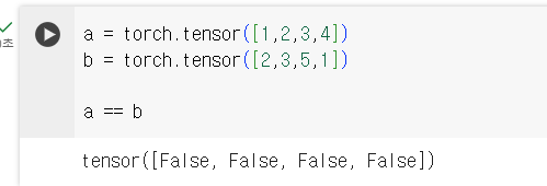 이렇게 하면 진짜 True인지 False인지 바로 알기 어렵다.. tensor의 원소 하나하나 True인지 False인지 체크해야하거든..