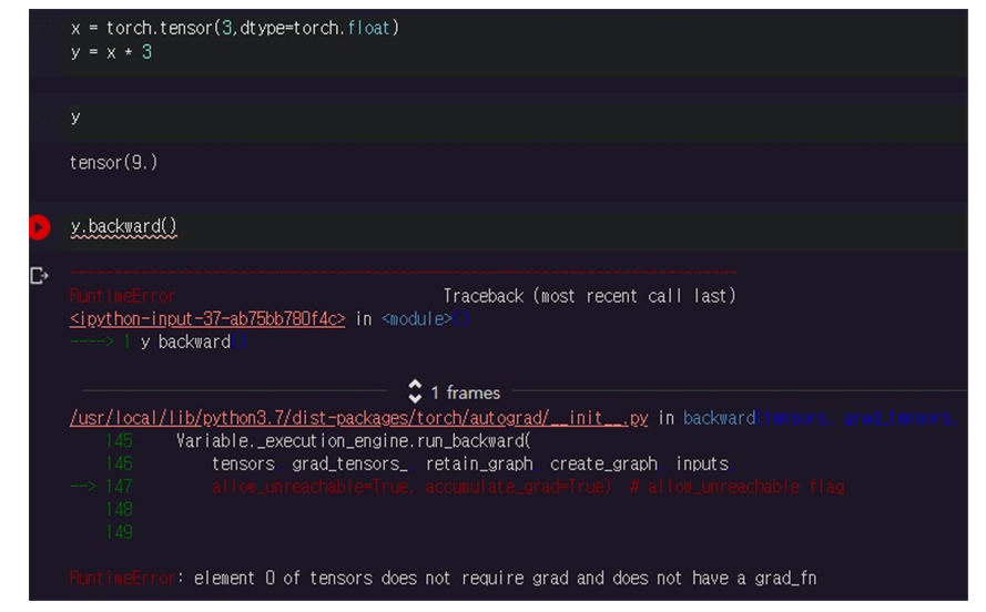 추가적으로 float single tensor인 경우에만 backward를 걸 수 있다.