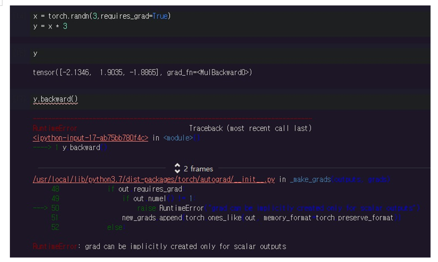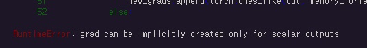 ‘grad can be implicitly created only for scalar outputs’라고 오직 스칼라 출력에 대해서만 grad를 계산할 수 있다고 나옴