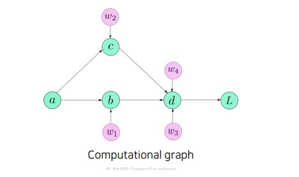 위의 그림은 a, b, c, d, L, w1,w2,w3,w4 9개의 변수 값들의 계산 과정이 기록되어 있는 computational graph이다.