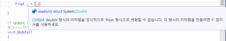 5.0을 double형으로 처리하고 5.0f는 float형으로 처리해준다