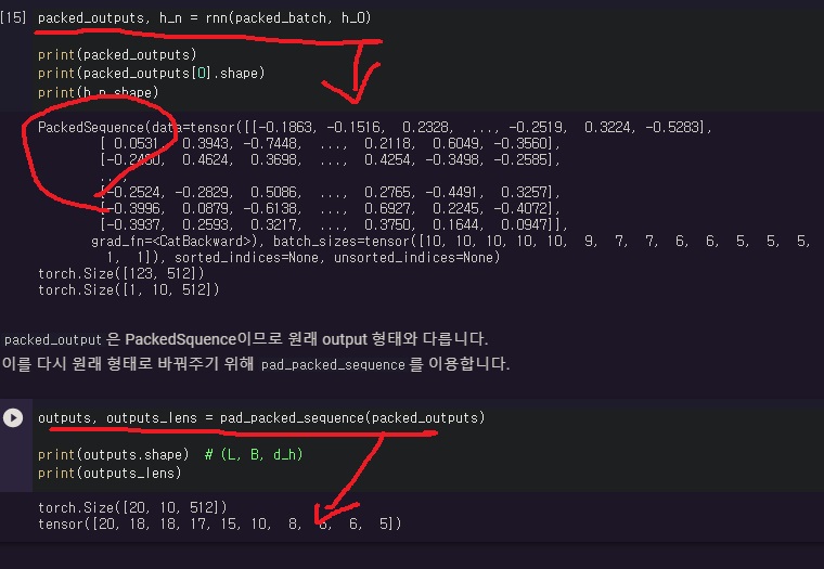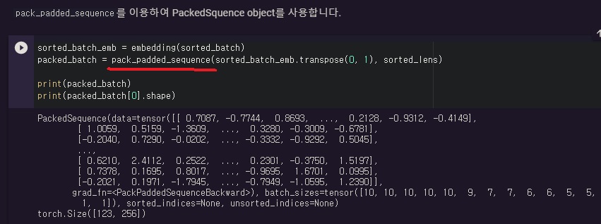 실제 RNN에 이런 방식으로 계산하겠다고 알려주기위해 packed sequence object로 처리해야한다.