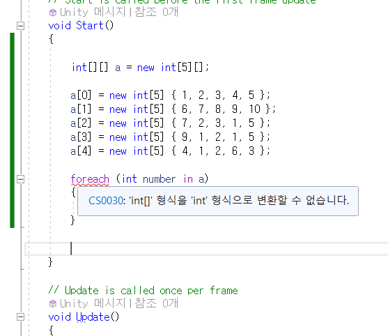 a 배열의 원소 하나하나가 크기 5인 배열인데 int로 해서