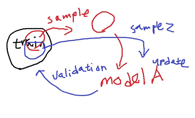 또 하나의 다른 model을 학습했다면 이전 round에서 학습한 model A와 지금 학습한 model B를 모두 사용하여 전체 training set에 대해 validation을 수행합니다.