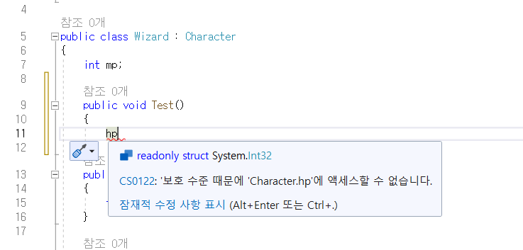 하지만 private와는 다르게 자식 클래스 Wizard에서는 hp에 접근할 수 있다