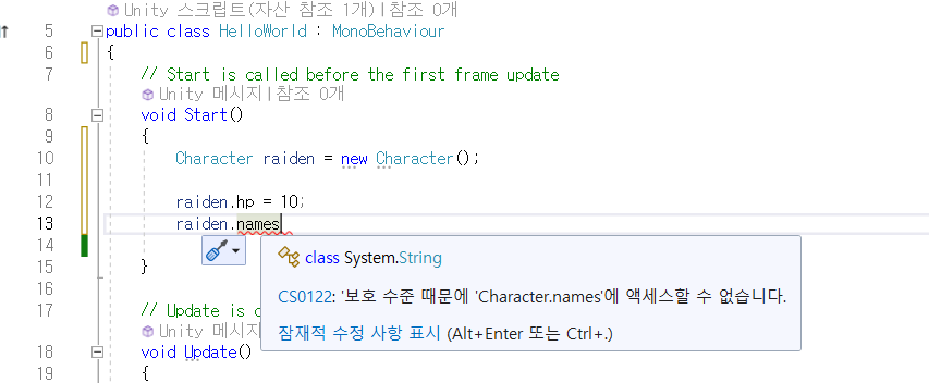 HellowWorld에서 Character instance를 만들고, hp에 접근하면 접근이 가능하고 값을 집어 넣을 수도 있지만