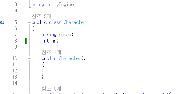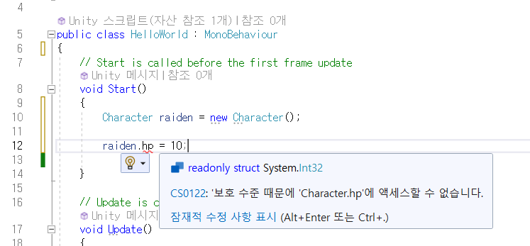만약 멤버변수를 public int hp;로 설정하면?