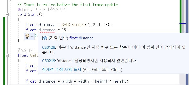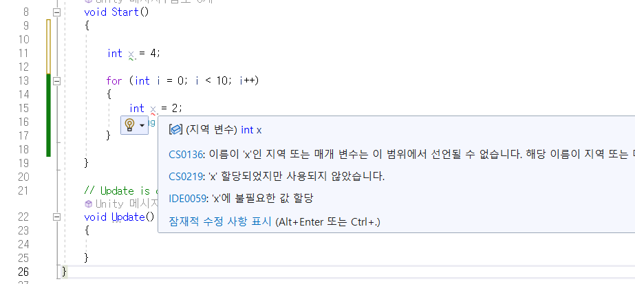 어떤 함수 내에서 만든 int x = 2;와 Start() 함수 내에서 만든 int x = 4;는 다른거라 에러가 나지 않는다