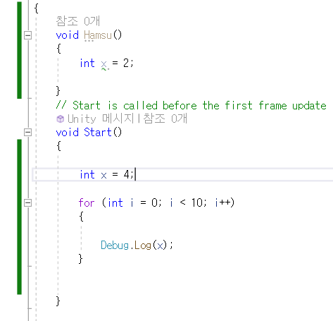 Hamsu() 내의 int x = 2;를 아무리 바꿔도, Start() 내의 int x = 4;에는 영향을 미치지 않는다