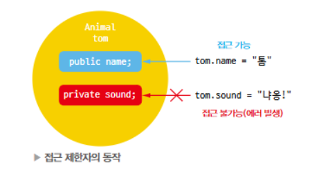 private: 밖에서 볼 수 없는 것(자식 클래스도 모름), 외부에서 해당 멤버변수에 접근할 수 없음