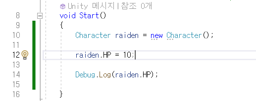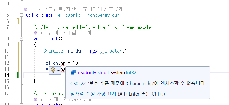 HellowWorld에서 Character instance를 만들고, hp에 접근하면 접근이 가능하고 값을 집어 넣을 수도 있지만