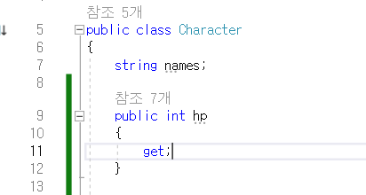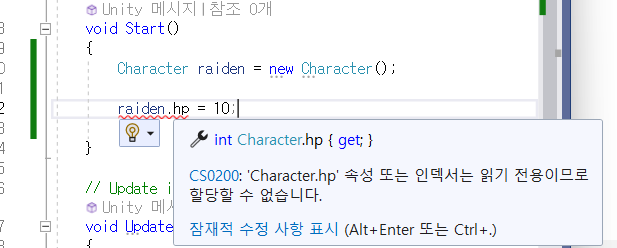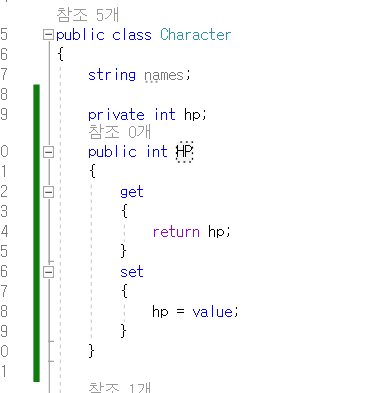 다른 방법으로는 다음과 같이 private int hp; public int HP; 2가지 변수를 설정하고