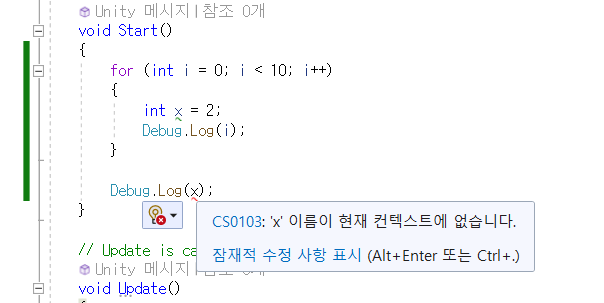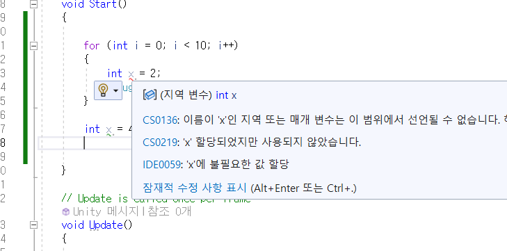 어떤 함수 내에서 만든 int x = 2;와 Start() 함수 내에서 만든 int x = 4;는 다른거라 에러가 나지 않는다