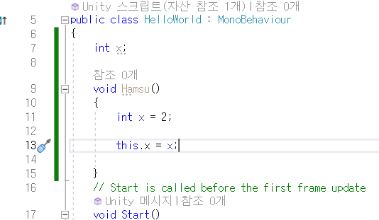 Hamsu()랑 Start()는 전혀 다른 스코프라 서로 영향을 미치지 않는다