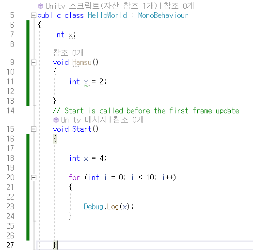 Hamsu() 내의 int x = 2;를 아무리 바꿔도, Start() 내의 int x = 4;에는 영향을 미치지 않는다