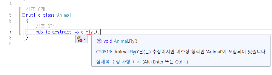 추상 method를 만들기 위해 public abstract void Fly()라고 abstract를 선언