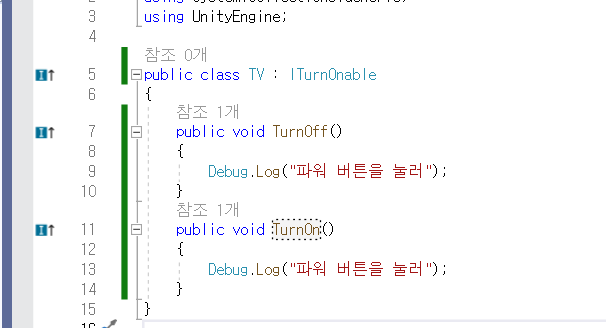 인터페이스를 구현한다는 뜻은 TV class내에 인터페이스 ITurnOnable의 method들이 실제 기능을 가지는 것
