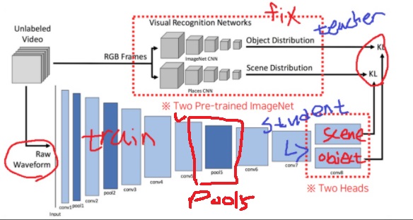 waveform의 object,scene recognition head의 feature사이 2개의 KL divergence loss로 waveform CNN을 학습