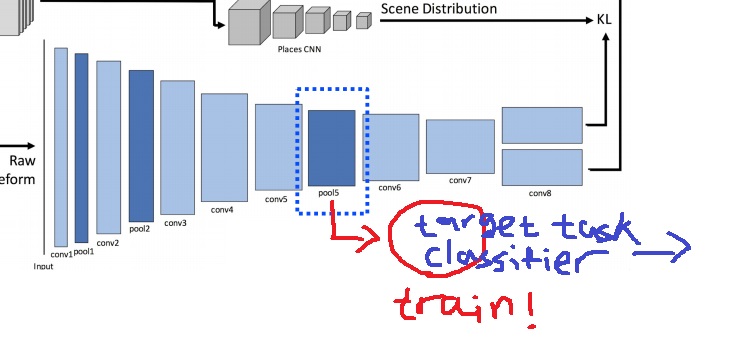 학습이 된 SoundNet의 sound CNN에서 Pool5 부분의 feature를 따로 뽑아 target task classifier를 만들어 학습