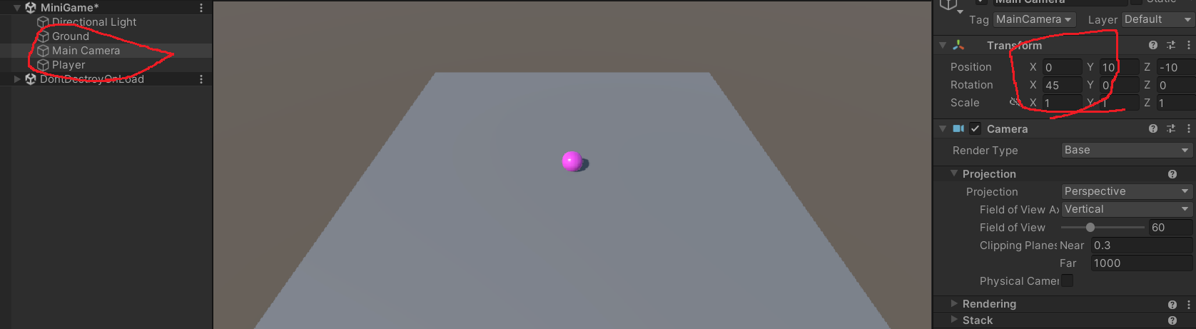 main camera에서 position을 조절하면 카메라 각도를 바꿀 수 있다