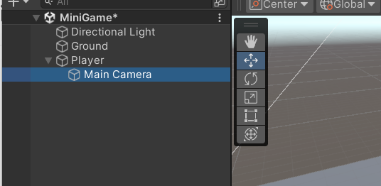 main camera를 드래그해서 player쪽에 놓으면 player의 자식이 되는데